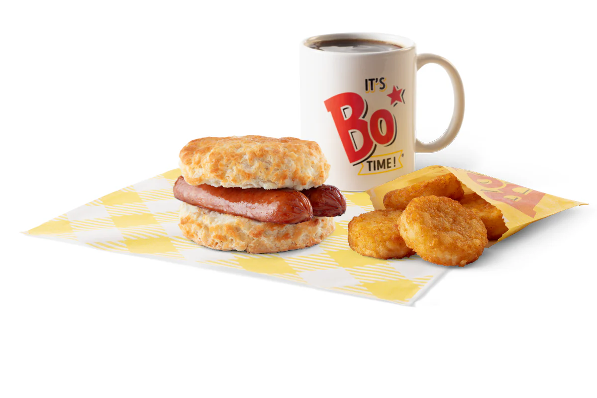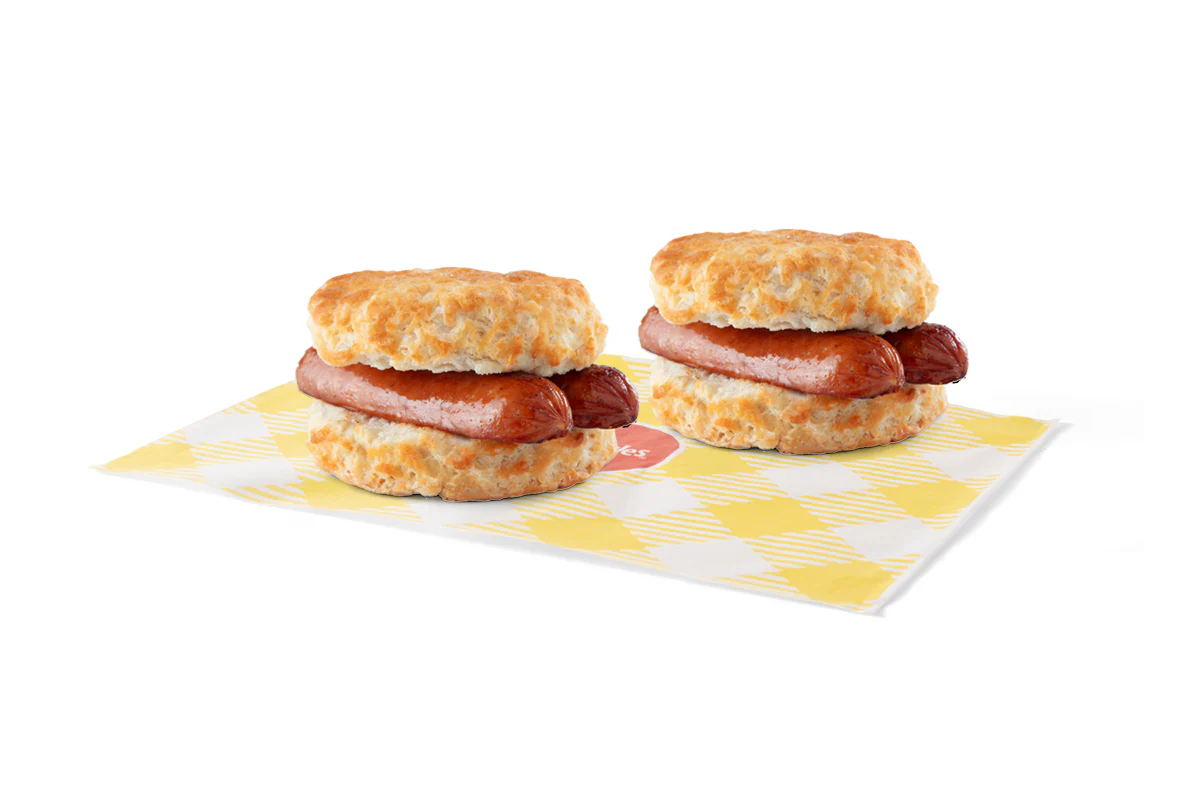Two juicy, perfectly seasoned sausage patties on a scratch-made buttermilk biscuit served with a fixin' and a regular drink.