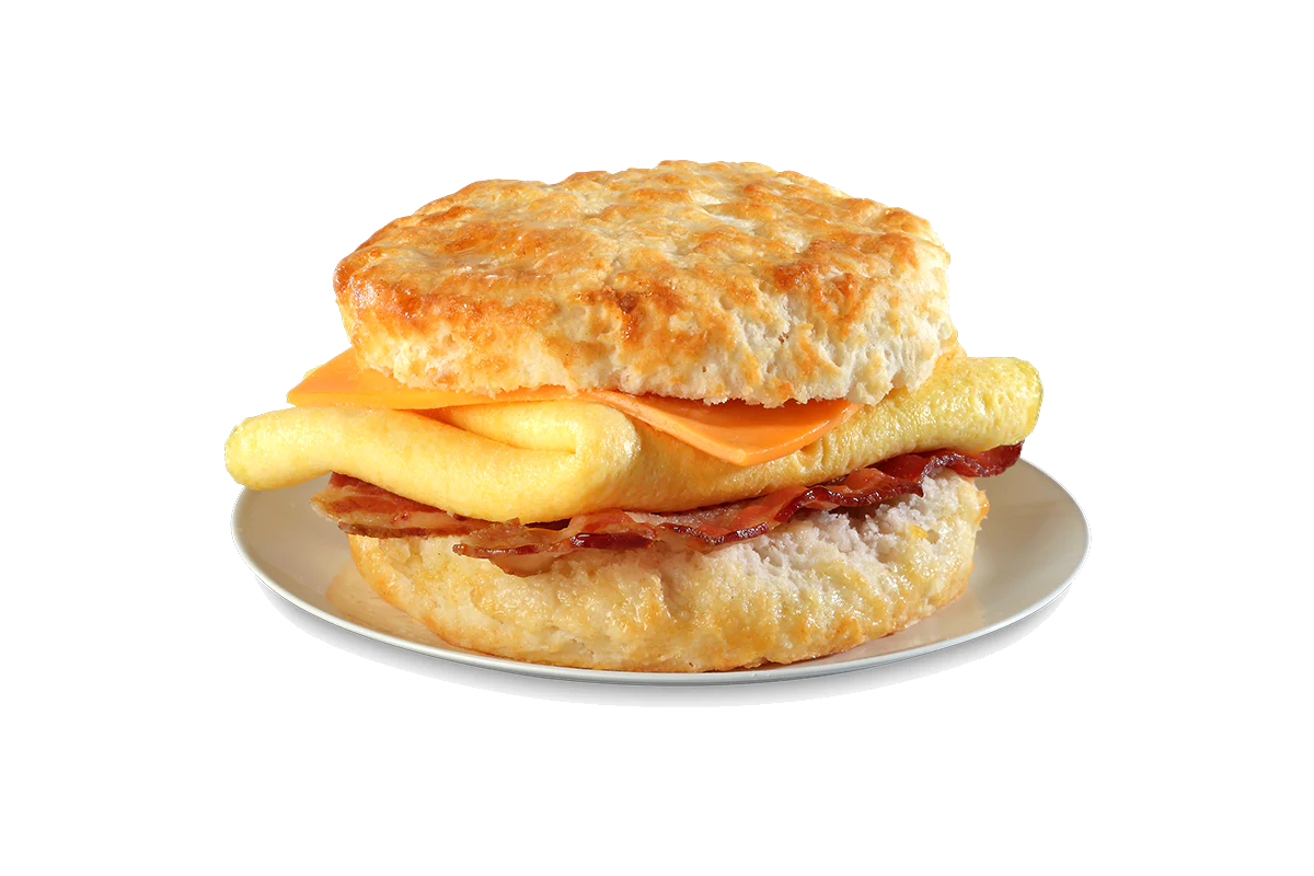 A fluffy golden egg between juicy hardwood-smoked bacon and sharp, melted American cheese on a scratch-made buttermilk biscuit, served with a fixin' and regular drink.