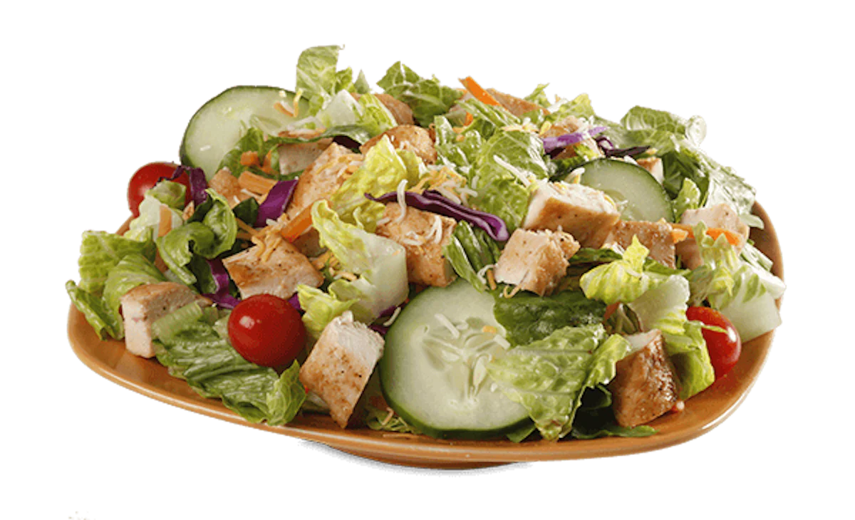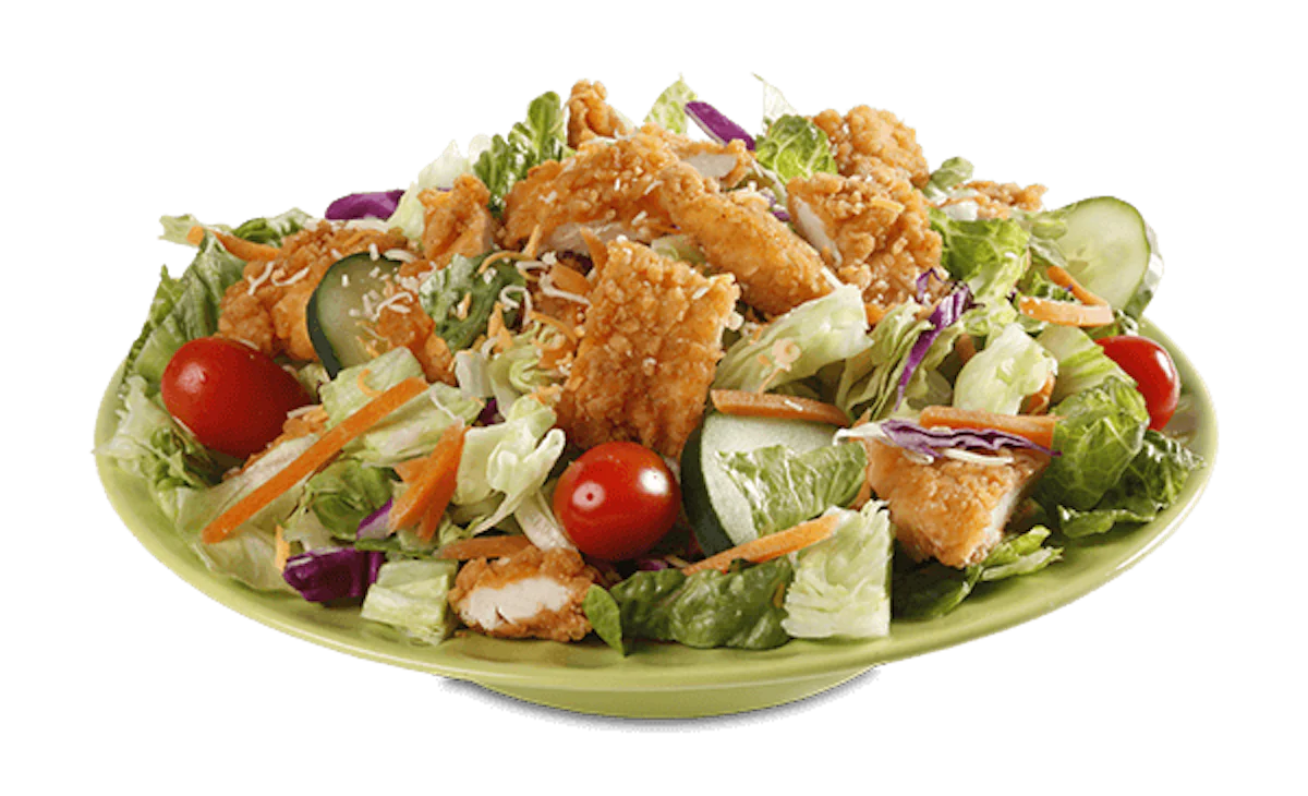 Three crispy, boneless chicken tenders marinated with a bold blend of seasonings served on a bed of fresh green leaf lettuce, red leaf lettuce, and baby spinach topped with cucumber slices, grape tomatoes, and Monterey Cheddar Cheese.