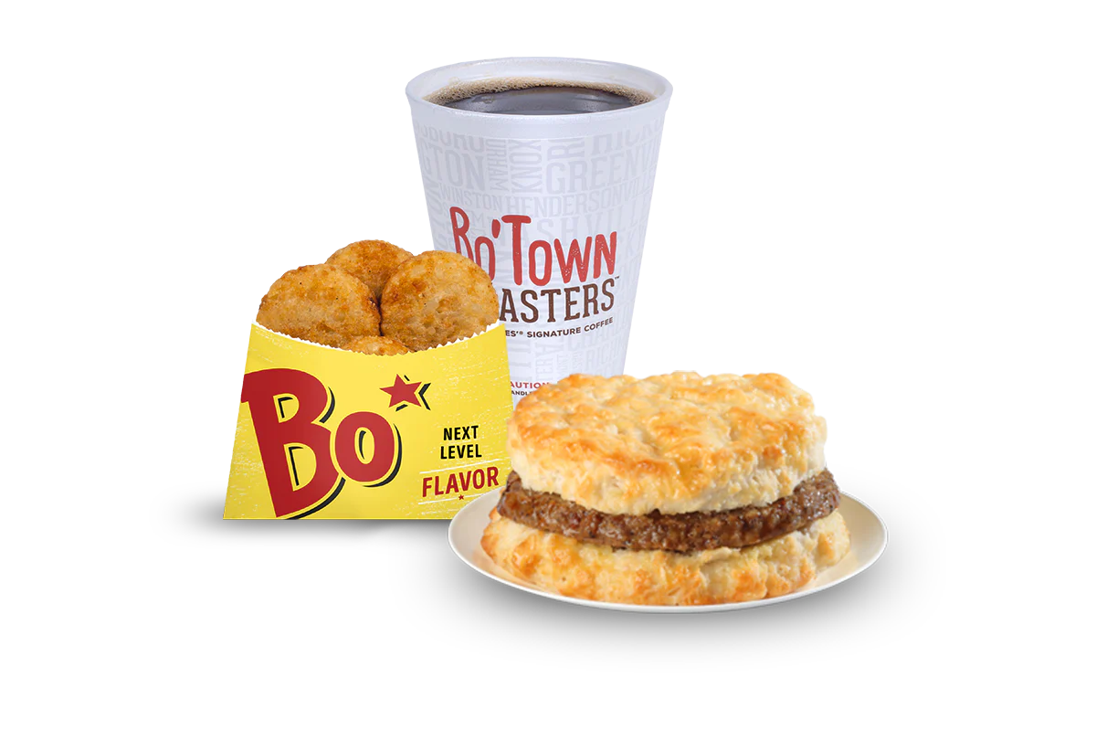 A juicy, perfectly seasoned sausage patty on a scratch-made buttermilk biscuit, served with a fixin' and a regular drink.