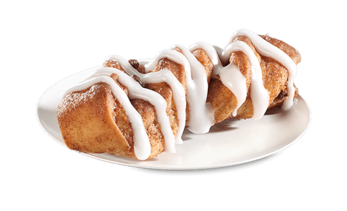 Cinnamon covered, freshly baked twists drizzled with icing on top.