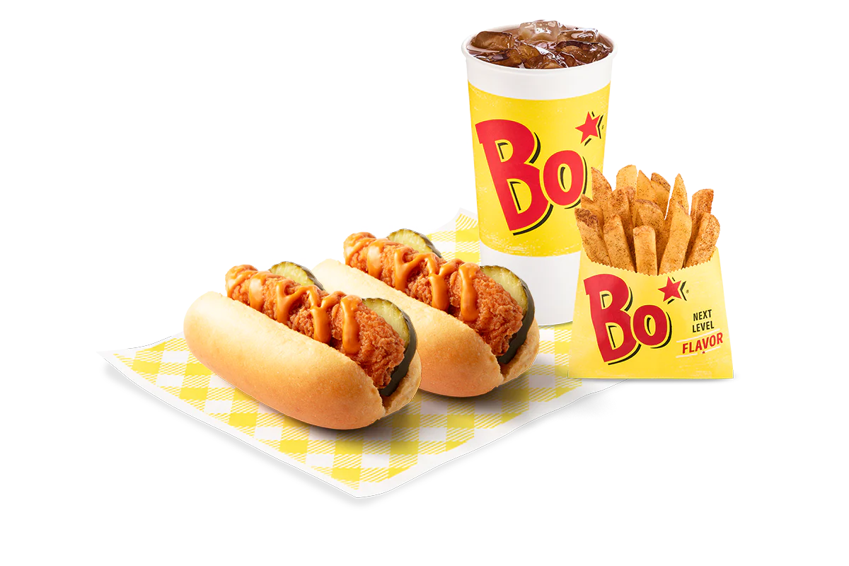 2 Bo's Chicken Supremes each in a warm toasted potato bun, with two thick cut dill pickles, and drizzled with Carolina Gold BBQ Sauce. Served with your choice of fixin, and a medium drink.