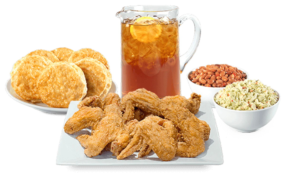 Twelve of our juicy wings, fried and tossed in our special seasonings and served with six scratch-made buttermilk biscuits, two picnic-sized fixins and a 1/2 gallon of our legendary iced tea.