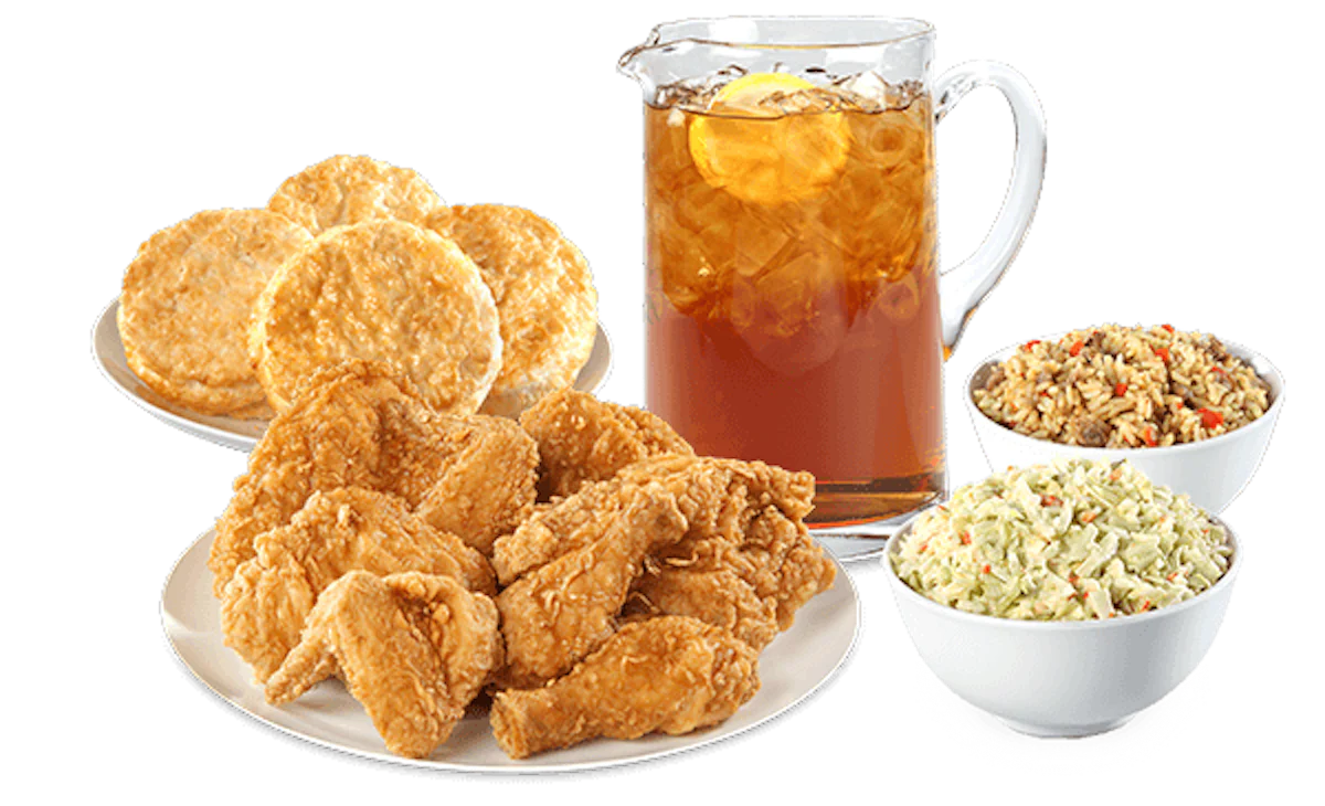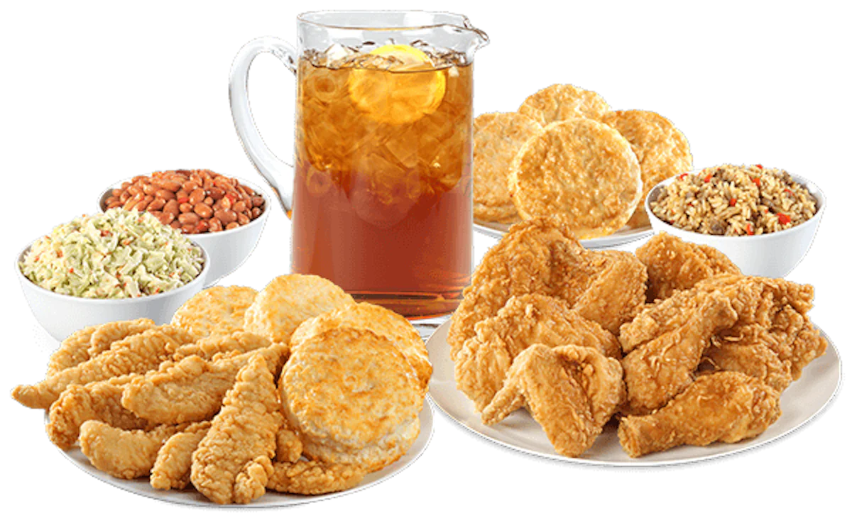 Eight pieces of our legendary cajun chicken, fried and tossed in our special seasonings, Twelve pieces of our juicy, boneless tenderloin filets, eight scratch-made buttermilk biscuits, three picnic-sized fixins and a gallon of our legendary iced tea.