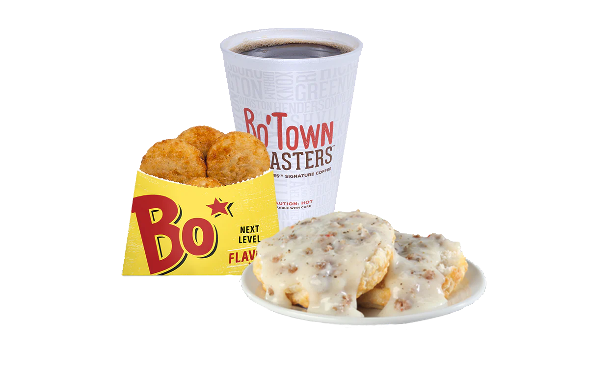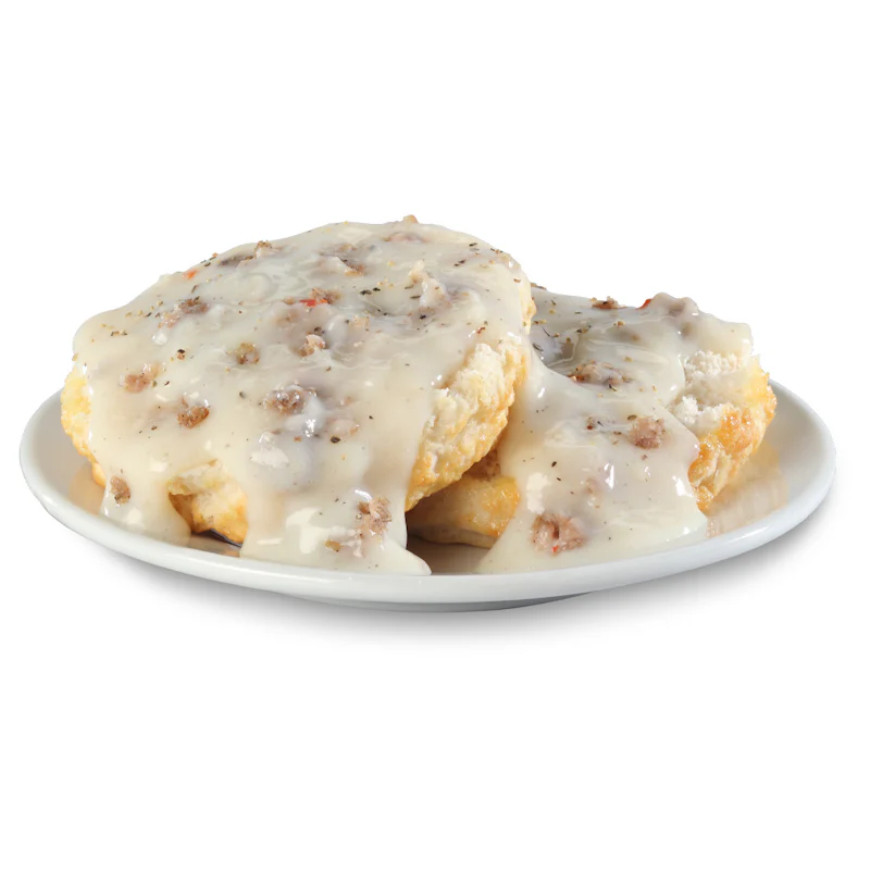 Our delicious country-style gravy on a scratch-made buttermilk biscuit, served with a fixin' and a drink.