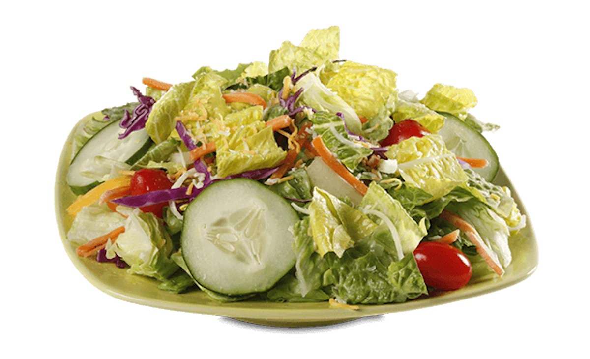 Fresh green leaf lettuce, red leaf lettuce, and baby spinach topped with cucumber slices, grape tomatoes, and Monterey Cheddar Cheese.
