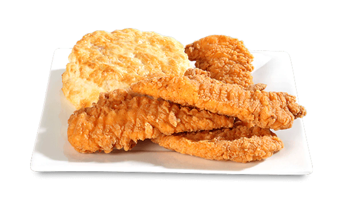 Two boneless chicken tenders served with a made-from-scratch buttermilk biscuit, a fixin, and a small drink.