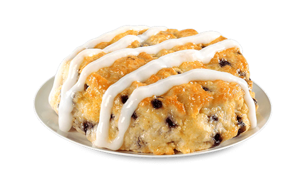 Freshly baked, made from scratch biscuit with blueberries mixed in and topped with sweet icing.