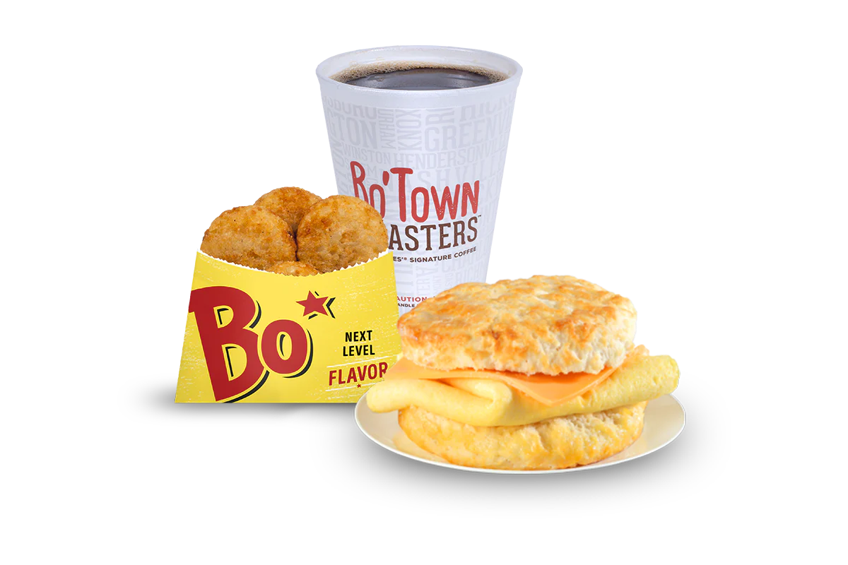 Sharp American cheese melted over a fluffy golden egg on a scratch-made buttermilk biscuit, served with a fixin' and a regular drink.